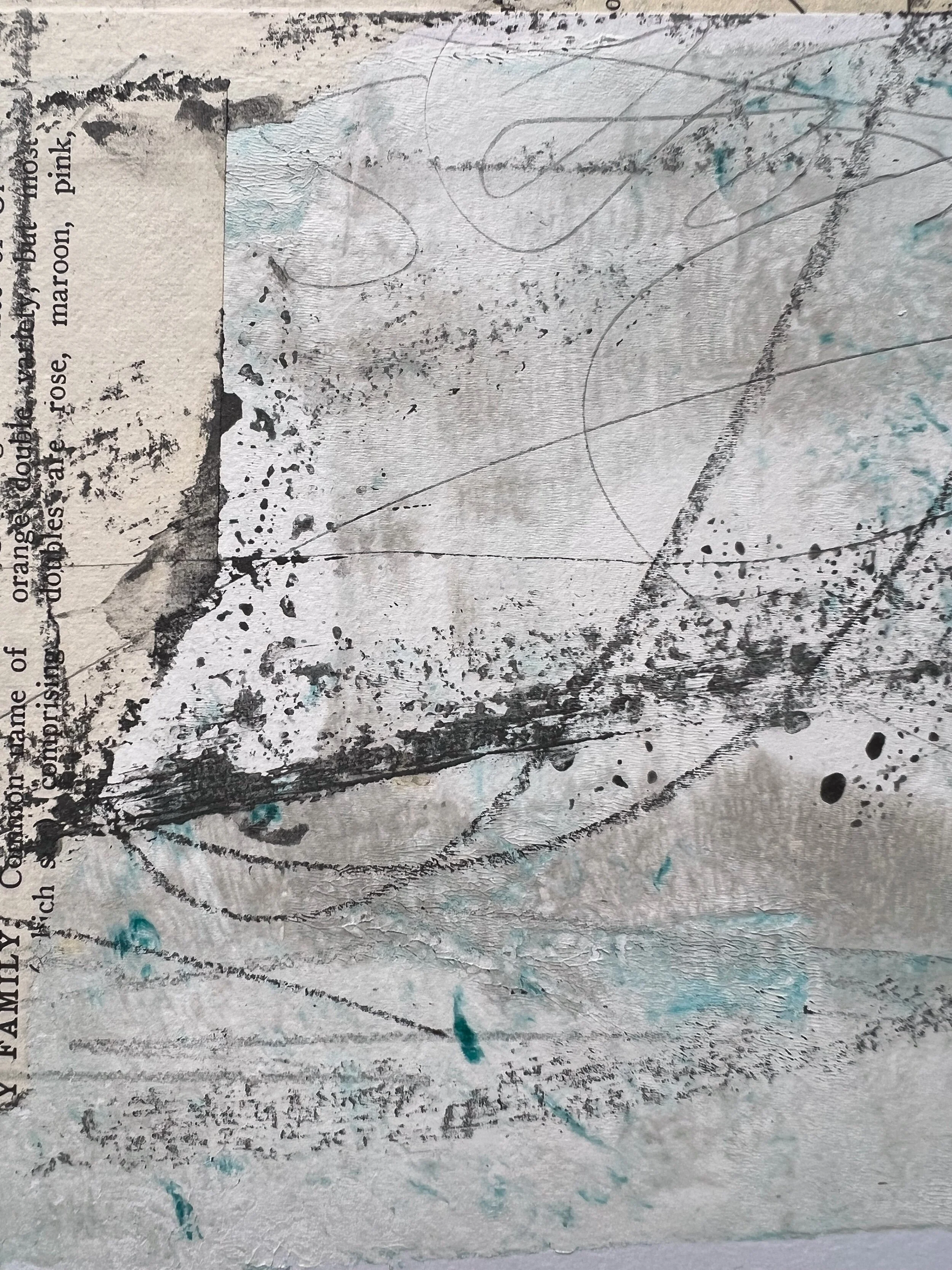 I love the feel of the texture of the surface. The size feels right, and the rigid surface will be a delight. After the first two layers - collage and graphite mark making, it is my favorite.