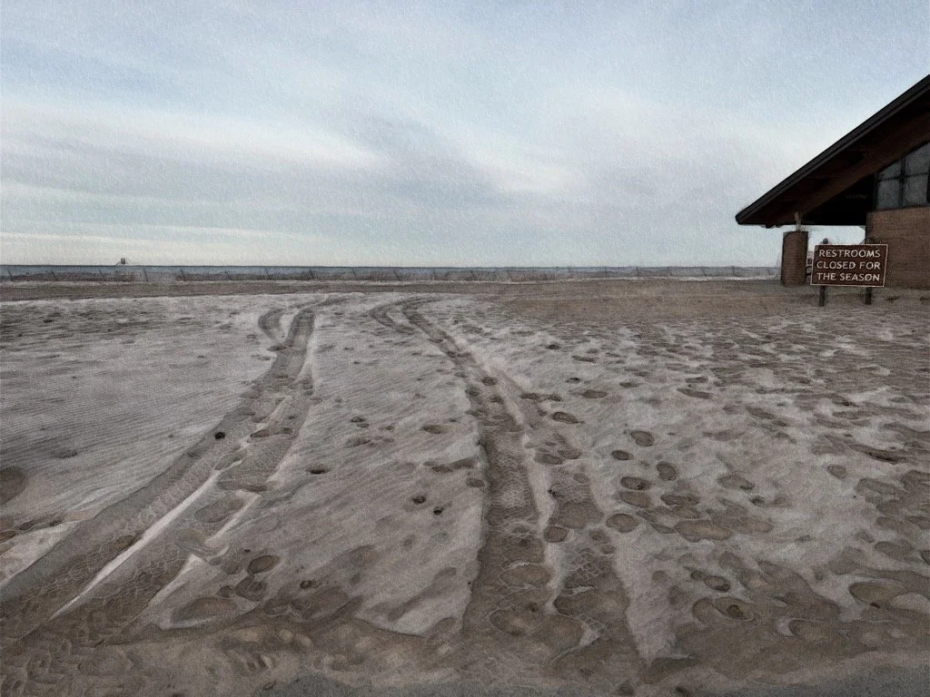 Still, ever the optimist, I try to find something good in most situations, and I figured thanks to my knee pain, I got this shot of the first frost of the season as it rested on the sand, while heavily empathized the tire tracks and the footprints.